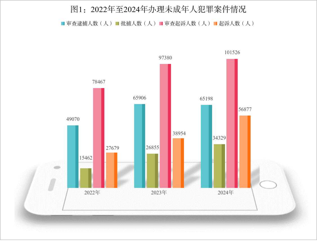 (1)受理审查起诉未成年人犯罪人数增幅放缓。2024年,全国检察机关受理审查逮捕未成年犯罪嫌疑人65198人,同比下降1.1%,批准逮捕34329人,同比上升27.8%;受理审查起诉未成年犯罪嫌疑人101526人,提起公诉56877人,同比分别上升4.3%、46%。