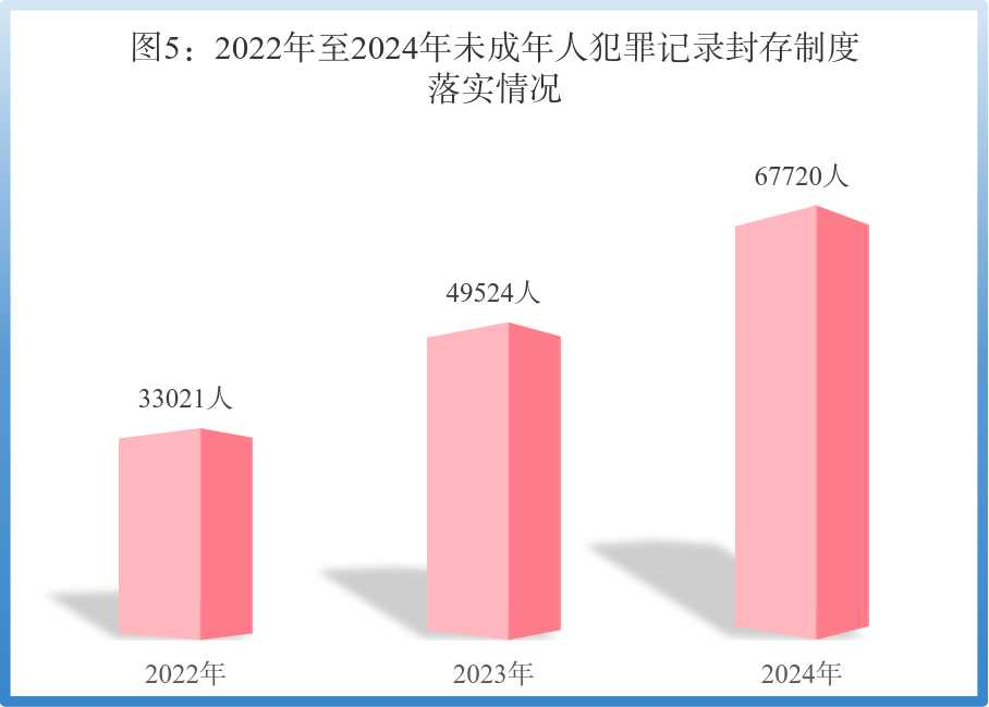 (5)依法适用未成年人法律援助、犯罪记录封存制度。2024年,认真落实未成年人刑事案件诉讼程序和特殊保护制度,全国检察机关通知法律援助机构为未成年犯罪嫌疑人提供法律援助51791人次,对符合条件的未成年人落实犯罪记录封存67720人。